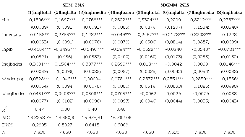 Estes resultados sugerem que as recentes mudanças no BNDES podem ter resultado em impactos deletérios sobre a estrutura produtiva local, dada a redução recente nas liberações de crédito e considerando o efeito positivo deste coeficiente do crédito do BNDES sobre a especialização da estrutura industrial das microrregiões. Os efeitos acerca do QL do crédito do BNDES dos vizinhos foram significativos somente no modelo SDM e SDM-2SLS.