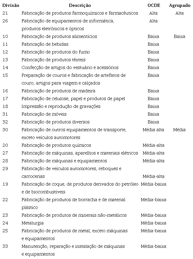 Quanto aos setores da indústria de transformação utilizados e a sua relação com a intensidade tecnológica, foram empregadas aqui as classificações tecnológicas da OCDE3, disponibilizadas por Cavalcante (2014) (Quadro A1 – Apêndice A), agrupadas na divisão da Classificação Nacional de Atividades Econômicas (CNAE) de dois dígitos para o caso brasileiro. Neste estudo foram formados três grupos: alta, média (média-baixa e média-alta) e baixa intensidade tecnológica.