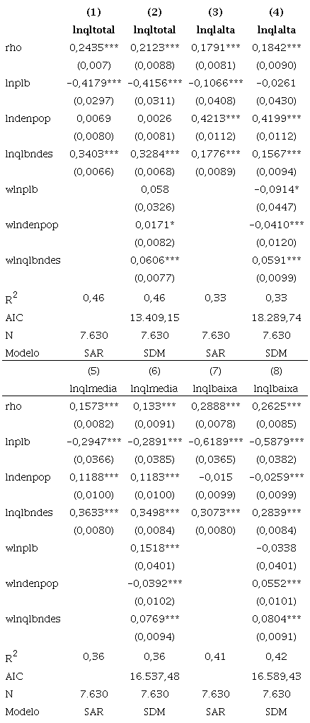 Com relação ao processo de autocorrelação espacial, o coeficiente positivo de rho confirma as suposições prévias de que nas microrregiões brasileiras há uma relação espacial positiva e significativa entre o QL dos vínculos da indústria com os seus vizinhos. Tal efeito não ocorre quando se consideram os vínculos de alta intensidade tecnológica (lnqlalta), muito pelo fato de que as microrregiões com este tipo de especialização são mais distantes entre si no espaço territorial brasileiro e também porque há menos microrregiões especializadas neste tipo de indústria. É evidenciado, por outro lado, que microrregiões especializadas em vínculos de média intensidade tecnológica possuem maior autocorrelação com seus vizinhos, indicando maiores transbordamentos.