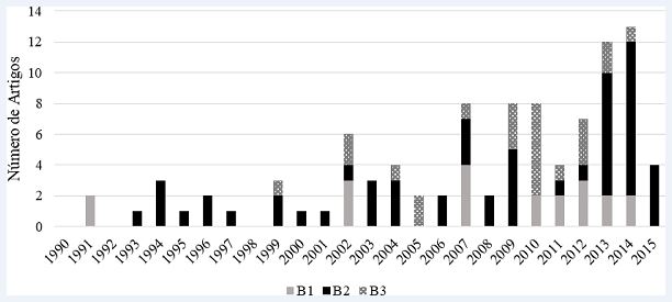 O recorte temporal utilizado, delimitado entre 1990 e 2015, faz referência ao período em que a Economia Feminista é reconhecida como uma corrente crítica da Economia, limitado pelo ano que marca o auge da quarta onda do feminismo no Brasil, a partir do qual o movimento e suas representações assumem feições diferenciadas (Hollanda, 2018)5. No que cabe às definições dos periódicos, o sistema Qualis (que é utilizado para classificar a produção científica dos programas de Pós-Graduação no país a partir dos artigos publicados em periódicos científicos) considera revistas de alto impacto aquelas enquadradas nos estratos A1, A2 e B1. Como no Qualis 2014 nenhuma revista brasileira foi classificada entre os dois primeiros grupos, procede-se com a manutenção do mesmo número de estratos para os quais há representação, de modo a abarcar os critérios B1, B2 e B3. Nestes periódicos, que valem 60%, 50% e 30%, respectivamente, da pontuação máxima (A1), preza-se pela originalidade e por procedimentos de avaliação bem definidos, de modo a ser possível inferir que suas revistas possuem rigor científico.