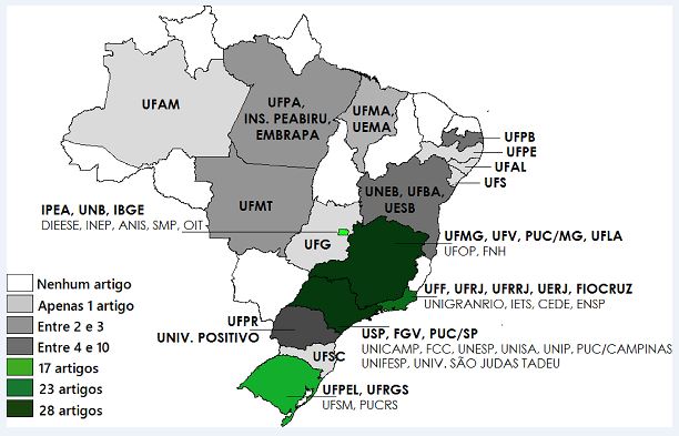 No que concerne à distribuição dos autores por instituições de ensino e pesquisa, é possível observar uma grande concentração de centros nacionais na produção acadêmica associada à Economia Feminista dos periódicos avaliados. Entre os autores de fora, o destaque fica para Estados Unidos, França, Espanha e Portugal. No Brasil, identifica-se um espraiamento da discussão por todo o território – com um claro predomínio das universidades do Sudeste e Sul, onde há maior aglomeração de pesquisadores do país, embora, nestes estados, também haja uma variedade significativa de centros envolvidos. Como identificado na Figura 2, as unidades federativas com maior representação no total foram São Paulo, Minas Gerais, Rio de Janeiro, Rio Grande do Sul e Distrito Federal, nas quais 38 instituições de ensino e pesquisa são citadas. Essa multiplicidade de atores não se reflete em fortes redes de contato, uma vez que a maioria dos trabalhos são realizados por autores que pertencem a uma mesma instituição.