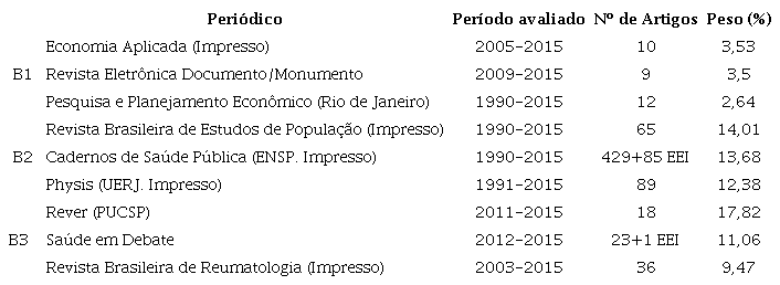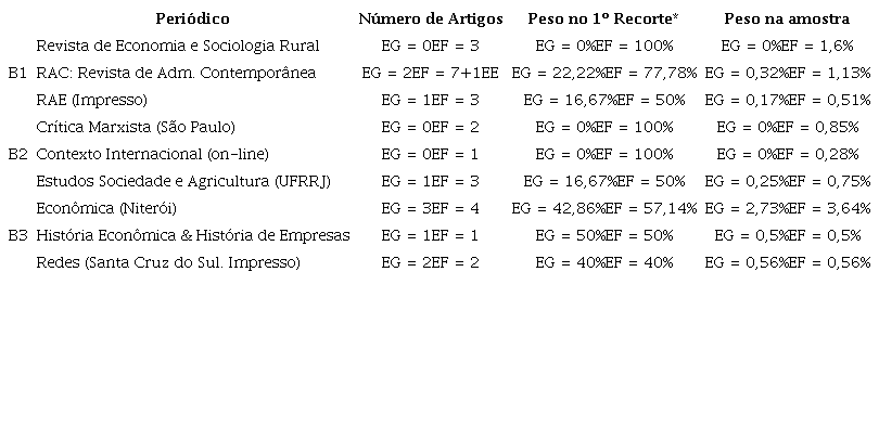 No estrato B2, o primeiro periódico que é efetivamente da área ocupa o 15º lugar, com 1,27% de inserção do tema pesquisado (Revista Econômica do Nordeste – REN) e, no estrato B3, sobe para a 6ª colocação, com 6,36% (Econômica). Cabe destacar ainda que, nestes grupos, há 18 periódicos sem qualquer referência ao grande tema discutido, totalizando 21,43% das revistas avaliadas.
