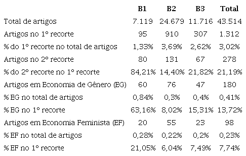 A partir da análise de 84 periódicos nacionais classificados em Economia, pelo Qualis 2014, como B1, B2 e B3 entre 1990 e 2015, o que delimita uma amostra de mais de 40 mil artigos, tem-se apenas 3,2% deles perpassados pela questão de gênero. Nesta representação, entretanto, o que pode ser associado às ideias da Economia Feminista é ainda menor – somente 0,23% da produção acadêmica avaliada (valor que é de 0,41% para o caso da Economia de Gênero). Estes artigos podem ser encontrados em todos os estratos verificados, embora numericamente sua representação seja maior nos periódicos B2.