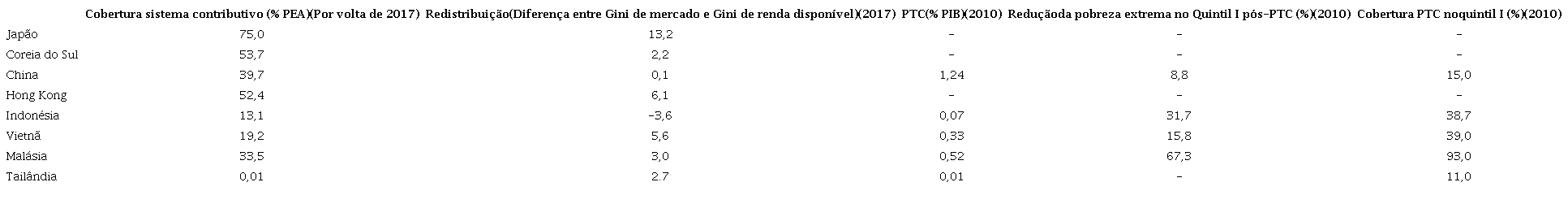 Entre 2001 e 2015, a China promoveu a expansão do tradicional “Programa de Garantia de padrões de vida mínimos’’ (Dibao) com maiores benefícios cobertura de 11 milhões de pessoas para 16 milhões nas áreas urbanas e de 3 milhões para 45 milhões nas áreas rurais (BDA, 2019). No entanto, o impacto desse programa sobre a pobreza é baixo, tendo em vista a ainda estreita cobertura no quintil mais pobre (Tabela 2). Em 2010, a Malásia introduziu o programa 1AZAM que oferece uma ampla gama de serviços para reduzir a pobreza, incluindo transferência direta de renda, políticas de reintegração no mercado de trabalho, subsídios, fornecimento de meios de produção para trabalhadores autônomos etc. (OIT, 2017). Trata-se do programa com a maior cobertura e com o maior impacto sobre a pobreza entre aqueles analisados na Tabela 2.