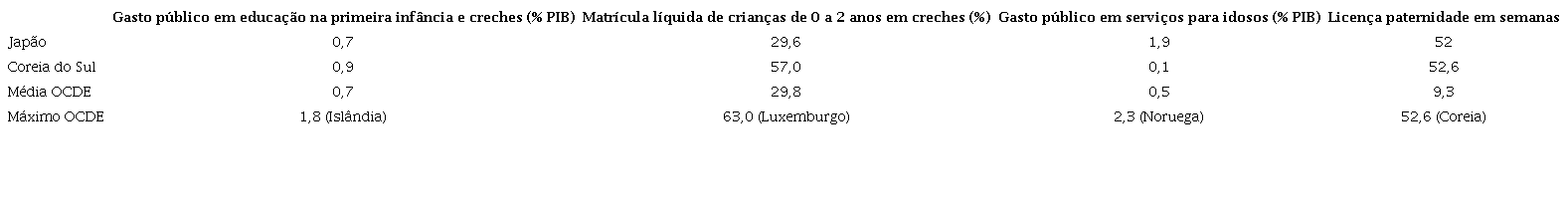No Japão, desde os anos 1990, estabeleceu-se um plano nacional de incentivo às mulheres a terem mais filhos, o que incluía políticas de cuidado infantil, extensão das licenças parentais e da cobertura da provisão de creches. Nos anos 2000, essas políticas foram ampliadas ainda mais, com aumento do suporte financeiro para creches, a redução sucessiva dos critérios de elegibilidade, de modo a contemplar até adolescentes de 15 anos de idade, em 2009. Mas o enfoque do Japão recaiu sobre as políticas de cuidado para idosos: inspirado pelos sistemas desenvolvidos na Suécia e na Alemanha, o Japão lançou o Novo Plano de Ouro, a partir do qual criou um sistema nacional de provisão de serviços de cuidado para esse grupo, em parte financiado por impostos e de outra parte por contribuições. Além da substantiva expansão desses serviços de cuidado, foi estabelecido uma série de programas de assistência de saúde focalizada para os idosos (Estevez-Abe, 2008; Aspalter; Liu, 2017). Em 2017, o Japão figurava entre os maiores gastos públicos em políticas de serviços para idosos (1,9 % do PIB) entre os países da OCDE, abaixo apenas da Noruega (2,1) e da Suécia (2,1).