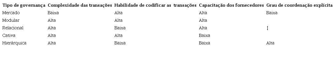 Essas estruturas de governança seriam influenciadas por três fatores, a citar, complexidade da informação transferida quanto às especificações do produto; capacidade de codificar essa informação; e capacitação dos fornecedores em atender às especificações das firmas compradoras. As combinações dessas características, que podem ter um resultado binário “alto” ou “baixo”, resultam nos cinco “tipos ideais” de governança, conforme exibidos no quadro a seguir: