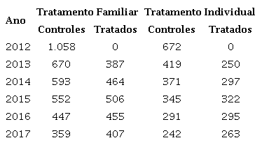 De um total de 2.248 indivíduos apoiados em tratamento familiar e 972 apoiados em tratamento individual identificados no CadÚnico, respectivamente 1.393 e 581 foram identificados no ano do pareamento (2012). Desses, respectivamente 1.034 e 531 apresentaram 4 anos ou mais de presença na base de dados. Observa-se, por fim, que como o pareamento foi realizado com poucas unidades tratadas e muitas unidades de controle nas bases municipais originais, o procedimento de trimming eliminou muitas observações consideradas não-comparáveis. Dessa forma, a amostra final contou com 529 indivíduos apoiados em tratamento familiar, e 336 apoiados em tratamento individual, com igual número de indivíduos não apoiados pareados como grupo de controle. Como esperado, verifica-se maior concentração de indivíduos na base de tratamento familiar. Também se verifica um caimento contínuo do número de indivíduos por grupo, sobretudo nos últimos dois anos.