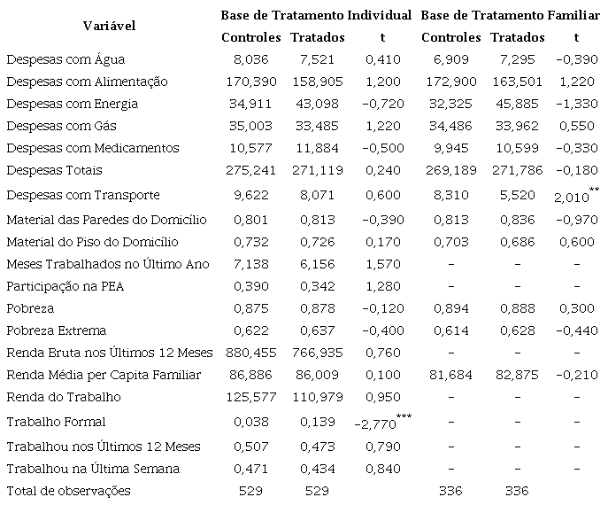 De maneira geral, os testes realizados verificaram bom pareamento para as bases. Apenas a variável de despesas com transporte, na base de tratamento familiar, e de trabalho formal, na base de tratamento individual, apresentaram diferenças significativas a 5%.