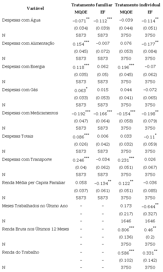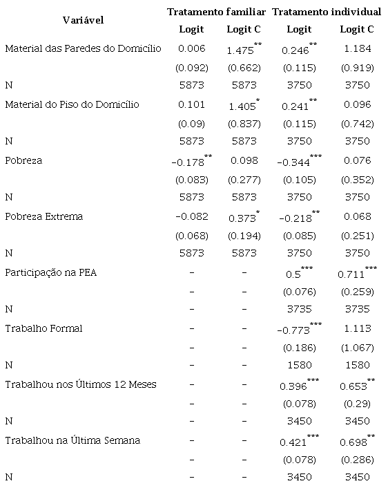 Os resultados estão representados nas tabelas a seguir. Destacaram-se os resultados considerados robustos, isto é, significativos e com mesmo sinal nas estimações baseadas no método de Efeitos Fixos tanto para o tratamento familiar, como para o tratamento individual, nesse caso para as estimações que consideraram os dois tratamentos. As estimativas realizadas a partir do método dos Efeitos Fixos são mais confiáveis do que aquelas feitas por Mínimos Quadrados Ordinários Empilhados porque elas lidam com possível viés de heterogeneidade entre os indivíduos. No caso das variáveis binárias, como verificou-se que os resultados estimados são sensíveis à baixa variabilidade das variáveis de interesse, sobretudo naqueles baseados no método da regressão logística condicional, foram considerados robustos os resultados significativos e com mesmo sinal obtidos com os dois métodos e nos dois tratamentos.