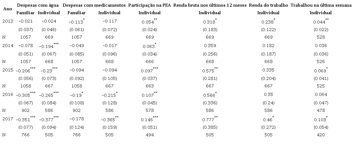 Considerando todas as estimações realizadas pelo presente trabalho, foram destacados os resultados que foram considerados robustos nos dois exercícios anteriores, isto é, de regressões por efeitos fixos ou modelos logísticos e de regressões por diferenças. Esses resultados são considerados os mais confiáveis de todos os obtidos pela presente avaliação, uma vez que se mantiveram ao longo de todas as especificações metodológicas. Os resultados robustos são a redução de despesas com água, redução de despesas com medicamentos, aumento na participação na população economicamente ativa, aumento da renda bruta em 12 meses, aumento da renda do trabalho e aumento do acesso ao trabalho na última semana. Destaca-se que a tendência ao longo dos anos mostra um crescimento da magnitude do coeficiente de impacto do tratamento sobre as variáveis relacionadas ao mercado de trabalho. Portanto, infere-se que o efeito do apoio é duradouro ao longo do tempo.