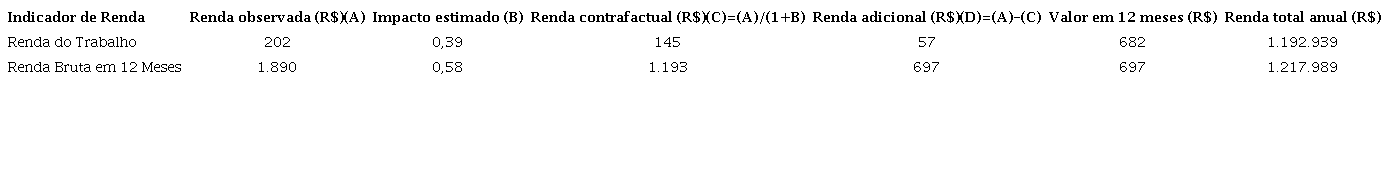 Dentre os resultados robustos, observa-se a redução de despesas com água (de 10,6% a 16%), assim como de despesas com medicamentos (de 15,3% a 18%). Para os indicadores relacionados ao mercado de trabalho, observaram-se resultados positivos expressivos, tais como o crescimento da renda bruta nos últimos 12 meses (58,4%) e da renda do trabalho (39,2%). Em relação às variáveis binárias, verificou-se crescimento da probabilidade de acesso a postos de trabalho dos indivíduos tratados em comparação com os indivíduos do grupo de controle. Assim, houve crescimento da probabilidade de participação na população economicamente ativa (de 64,9% a 103,6%), assim como do acesso ao trabalho nos últimos 12 meses (48,6% a 92,1%) e do acesso ao trabalho na última semana (de 52,3% a 101%)9. Por outro lado, entre aqueles que reportaram acesso ao trabalho nos últimos 12 meses, os tratados trabalharam menos meses, ainda que a diferença seja pequena (-0,644 meses).