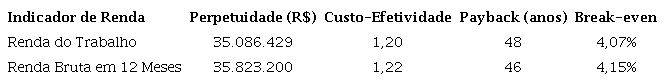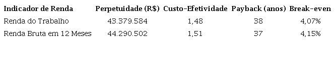O primeiro indicador calculado é o valor da perpetuidade, equivalente à razão entre o benefício e a taxa de desconto. O objetivo desse indicador é verificar o valor da soma dos benefícios anuais dos infinitos valores futuros em valor presente.