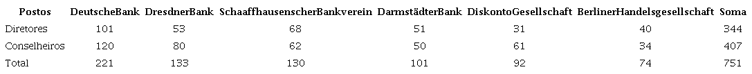 Na Tabela 1, fica patente a soma assustadora de 751 postos de diretoria e conselho em sociedades anônimas ocupados por representantes de apenas seis bancos. Apesar de não termos os dados referentes ao número de sociedades, é possível depreender a ostensiva presença dos bancos em posições decisórias, deliberativas ou fiscalizatórias nas maiores empresas alemãs. Eles forneciam o crédito, mas também o know how nos negócios, especialmente na área da contabilidade.