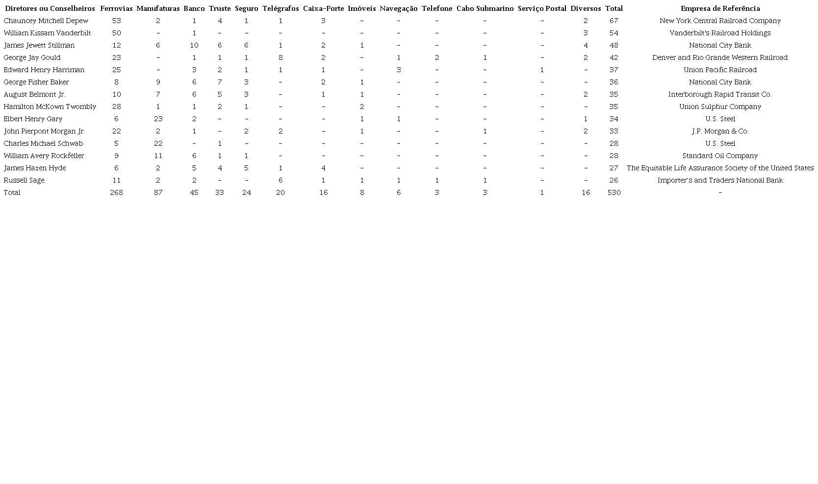 Também é possível constatar no Quadro 1 que as Empresa de Referência1 são, na maioria das vezes, bancos ou seguros (5) e empresas de transportes (5), ficando as indústrias em papel ligeiramente secundário (4). Os famosos magnatas atuavam como diretores e conselheiros em impressionantes 530 postos nas sociedades anônimas norte-americanas. Pouco mais da metade desses postos eram em empresas ferroviárias, mesmo tendo passado mais de uma década do estouro da bolha ferroviária norte-americana.