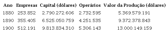 A Tabela 2, elaborada por Hobson a partir dos dados do 12º Censo dos Estados Unidos, indica clara tendência de expansão dos capitais de forma mais acelerada que o número de estabelecimentos e operários, assim como no valor produzido pelo computo geral das manufaturas. No setor manufatureiro e de transportes a concentração aconteceu primeiro, afetando por sua amálgama, após, os setores dos demais serviços, comerciais e da agricultura.