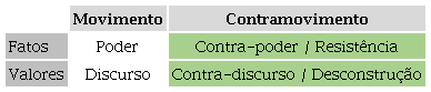Ao nos concentrarmos na última coluna do quadro, é possível, então, destacar como também a dinâmica do contramovimento, que intervém para proteger a sociedade do impacto das forças do mercado, vive uma tensão interna entre realidade e representação: entre uma ação de resistência e oposição material ao avanço do processo de mercantilização da terra, do trabalho e da moeda, e uma operação intelectual de desconstrução e desmascaramento da utopia do mercado autorregulado.