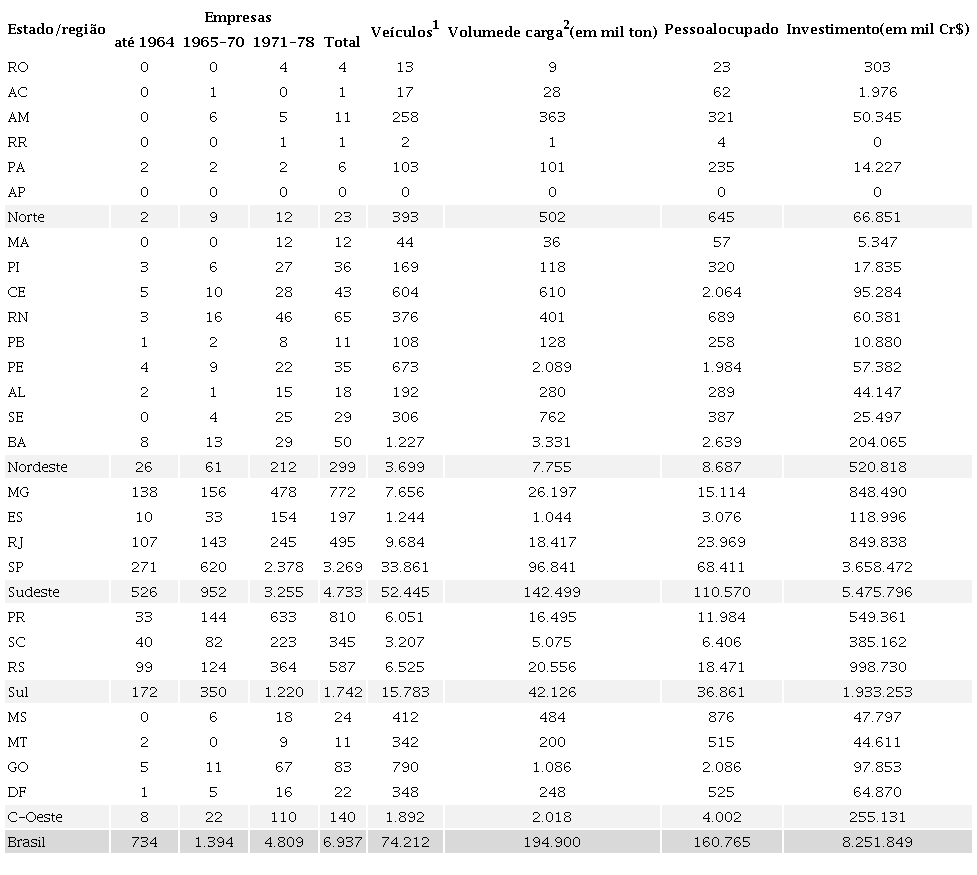 Em 1978, o IBGE editou um documento com ampla radiografia da classe empresarial do setor (Tabela 1) que evidencia o rápido crescimento do mercado6. Nesse sentido, Ziegler e Russo (apud Kapron, 2012) são enfáticos ao afirmar que na década de 1970 ficou visível a estruturação em bases empresariais do transporte rodoviário de carga. Entre os motivos citados estão o crescimento expressivo do número de empresas transportadoras atuantes em todo o território nacional, a implementação de ações de modernização empresarial, o incremento da concorrência e a já citada entrada do capital internacional em 1973 pelo grupo australiano TNT.