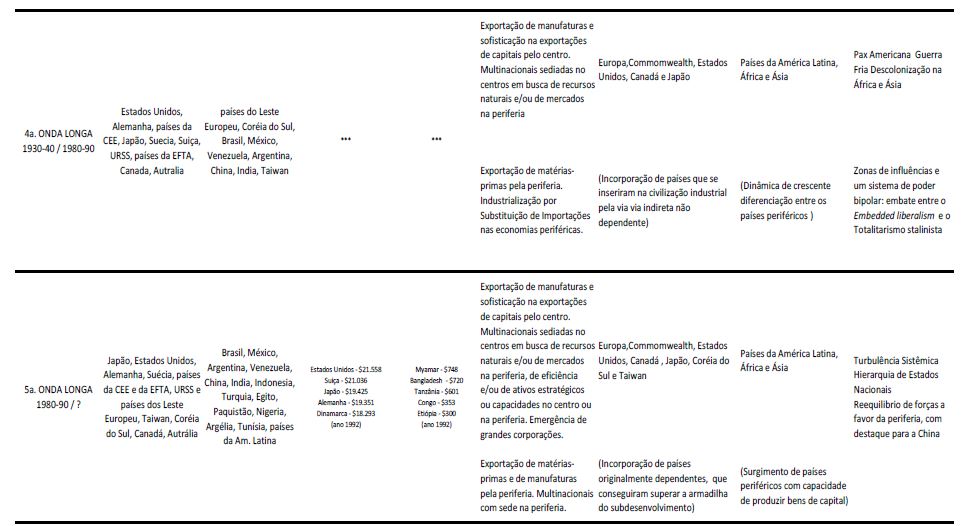 A dimensão tecnológica, por sua vez, é destacada no Quadro 3, que busca olhar as transformações no capitalismo a partir das revoluções tecnológicas. Em cada onda longa definida por Freeman e Perez (1988), são apresentadas mudanças no centro e na periferia que sugerem mudanças profundas no capitalismo.
