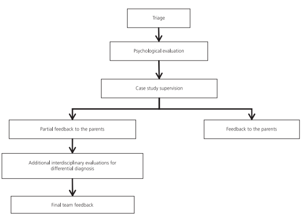 As shown in Figure 1, the children were initially evaluated (under supervision) by psychologists, members of the professional enhancement program. The evaluation started with a triage of the parents or guardians, in which is using anamnesis (case history) to obtain general information about school problems and child development. Subsequently, psychological evaluation sessions were held with the child, and additional information about the child's school performance and behavior pattern was obtained from the child's teachers. At the end of this first step, the case was discussed in supervision sessions to determine the child's clinical status, and a feedback session was then held with the parents or guardians to provide them with a psychological evaluation report, instructions, and other necessary care. The most common diagnoses made during these first steps of evaluation were related to intellectual and/or sensory disability.