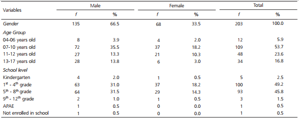 As shown in Table 1, the study sample was comprised of 203 children and adolescents (135 males [66.5%] and 68 females [33.5%]; ratio of 4:1) referred for evaluation. The ages ranged between 4 and 17 years old, with an average of 10 years and 11 months (Standard Deviation - SD = 2.47), and the majority of children were was nine years old (19.7). When the sample is distributed into age groups, it can be noticed that there was a higher frequency of referrals between 7 and 10 years old (53.7%), followed by 11 and 12 years old (23.6%). However, there were no significant differences in the distribution (p = 0.10; Fisher's exact test). The age of the males ranged from 4 to 17 years old (Mean - M = 10.24, SD = 2.63), and the females ranged from 5 to 16 years old (M = 9.85, SD = 2.13). There was no significant difference between the average ages between the genders (t(203) = 1.06; p = 0.289).