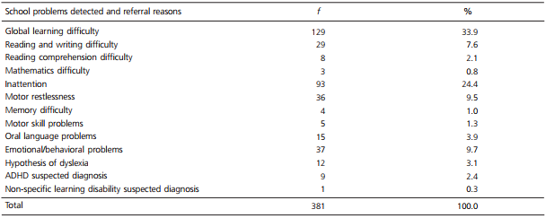 It was observed that most of the school problems reported that motivated the referrals were related to learning difficulties (44.4%) and attention problems (33.8%). These results also corroborate those of previous studies (Lima et al., 2006a, 2006b).