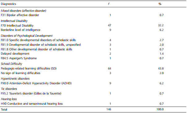 The remaining children (n = 146) completed the evaluation and according to the ICD-10 (World Health Organization, 2008), Table 4 shows that the most common diagnoses made were pedagogyrelated learning difficulties (43.8%) and intellectual disability (32.2%). With regard to the psychiatric diagnosis, it is observed that 6.2% (n = 9) of the children evaluated had ADHD, 0.7% (n = 1) had bipolar affective disorder, 0.7% (n = 1) had Asperger's syndrome, and 0.7% (n = 1) had Gilles de la Tourette syndrome. As for the learning disorders, 2.7% (n = 4) were diagnosed with specific reading disorder (developmental dyslexia), 2.1% (n = 3) with Mixed disorder of scholastic skills, and 0.7% (n = 1) with other developmental disorders of scholastic skills (written expression). It was also observed that 2.1% (n = 3) did not show any sign of learning difficulties.