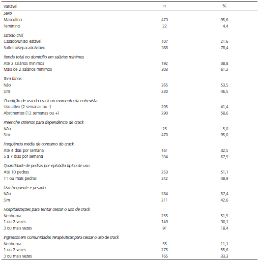 Foram entrevistados 495 usuários de crack com idades entre 14 e 54 anos (Média - M = 27,9 anos, Desvio-Padrão - DP = 7,3 anos) e tempo desde a primeira experiência com crack variando de menos de um ano a até 26 (M = 6,3 anos, DP = 3,9 anos). A Tabela 1 apresenta a distribuição dos entrevistados segundo dados sociodemográficos, padrão de consumo, condição atual em relação ao crack e passagem por hospitais e Comunidades Terapêuticas. Os participantes eram, em sua maioria: homens, sem companheira/o, com renda familiar de dois ou mais salários mínimos e possuíam filhos(as).