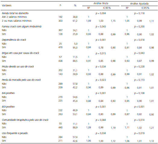 Foram tomadas como variáveis de confusão aquelas que tiveram associação com o desfecho e a exposição de interesse com um nível de significância de p < 0,20. Aquelas identificadas nessa condição e inseridas no modelo foram: renda total no domicílio do entrevistado (soma das rendas de quem coabitava com o mesmo), categorizada em até dois e dois ou mais salários mínimos nacionais (Lima-Costa, Firmo, & Uchôa, 2005); ter fumado crack com algum de seus irmãos ou irmãs (variável categórica do tipo Sim/Não); dependência de crack (variável categórica do tipo Sim/Não), obtida pela soma de três ou mais respostas afirmativas às sete questões propostas pelo National Surveys on Drug Use and Health (Hughes, Sathe, & Spagnola, 2009) e compatíveis com os critérios do Diagnostic and Statistical Manual of Mental Disorders -IV Text Revision (DSM-IV-TR); brigas em casa em função do uso de crack (variável categórica do tipo Sim/Não); já ter sido preso por causa do uso da droga (variável categórica do tipo Sim/Não); já ter perdido casa ou moradia devido à droga (variável categórica do tipo Sim/Não); escore no BAI (Cunha, 2001) positivo para sintomas ansiosos de qualquer intensidade (variável categórica do tipo Sim/Não); escore no BDI (Beck et al., 1961; Cunha, 2001) positivo para sintomas depressivos de qualquer intensidade (variável categórica do tipo Sim/Não); já ter ingressado em Comunidades Terapêuticas em função do uso do crack (variável categórica do tipo Sim/Não).