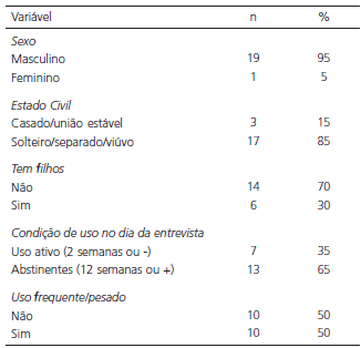 Nas entrevistas em profundidade, a mesma associação entre cessação do crack e histórico de uso frequente e pesado apareceu. Algumas características do grupo de pessoas entrevistadas tiveram distribuição semelhante à da amostra na etapa quantitativa. A Tabela 3 mostra sua distribuição quanto ao sexo, estado civil, filhos, condição atual de uso do crack e padrão usual de consumo nos últimos seis meses de uso. Nessa etapa, todos preencheram os critérios para dependência e estavam vinculados a centros de atendimento.