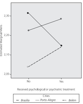 An association effect in terms of the factor problem denial indicates that there was an increase in the mean of this barrier in Brasília and Belém for the participants who had received or were receiving P/PTr and a decrease in the mean for the participants from Porto Alegre, (Figure 1). There was no effect of interactions for the factors fear of stigmatization and structural barriers.