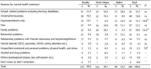 Considering only the participants who had received or were undergoing P/PTr, the analysis focused on identifying the type of problems the participants faced receiving professional help. A total of 466 problems were reported. School-related issues were the most commonly reported problem, followed by anxiety, depression, and fear. Behavioral issues and relationship problems with family and friends were the third most commonly reported problems. There were significant differences between the cities investigated in the following issues: (a) depression: there was a higher incidence in Brasília and Belém; (b) family problems: higher incidence in Porto Alegre and lower incidence in Belém; (c) emotional problems: higher incidence in Porto Alegre (Table 1).