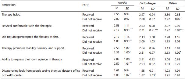The perceptions of the participants who had and those who had not received P/PTr were analyzed separately by city. It was observed that, in the three cities, those who had received P/PTr tended to agree more with the statement about feeling comfortable with the therapist. As for the statement 'therapy helps', the average score of the participants who had received P/PTr was higher than that of those who had not received it, only for the participants from Belém. The participants from Brasília and Belém who had had experience with P/PTr agreed that therapy promotes more stability, security, and support. The participants from Brasília who had received or were receiving P/PTr showed the highest rate of agreement with the statement regarding being able to express their own opinion in therapy. On the other hand, the children and adolescents from Brasília and Porto Alegre who had not received P/PTr agreed that more people frown, looking at them with disapproval when they are at a doctor's office or health center (Table 2). There was no association between location and treatment.