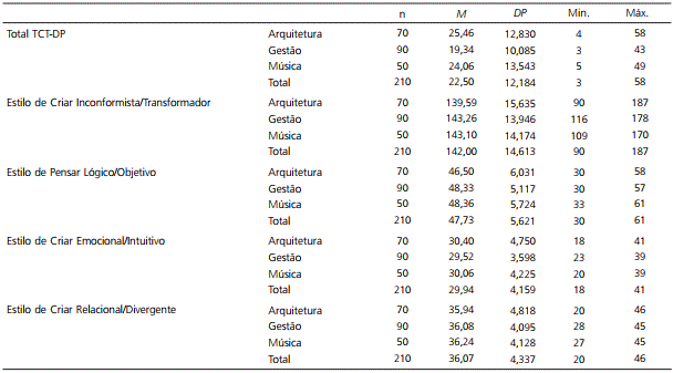 No presente estudo foram também encon-tradas diferenças estatisticamente significativas nos níveis de criatividade a favor dos alunos de Arqui-tetura quando comparados com os alunos de Ges-tão e de Música. Assim, os alunos de Arquitetura parecem evidenciar maiores níveis de criatividade quando avaliados com o TCP-DP. Não é alheio a esse resultado o fato de o TCT-DP ser um teste total-mente figurativo, onde os arquitetos, pela natureza da sua formação, poderão estar em condições mais vantajosas para obter melhores resultados, pelo que, futuramente, seria importante repensar a adequa-bilidade do referido teste a populações específicas ou de formas alternativas para a avaliação da criati-vidade. É importante salientar que não foram en-contradas diferenças estatisticamente significativas relativamente aos índices de criatividade entre os alunos de Gestão e de Música, apesar destes últimos evidenciarem índices muito próximos aos dos alunos de Arquitetura.