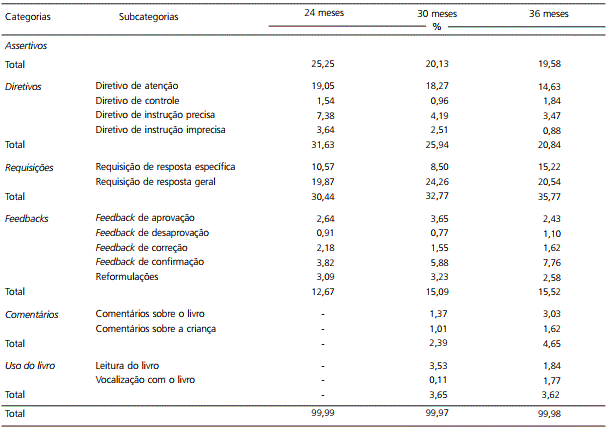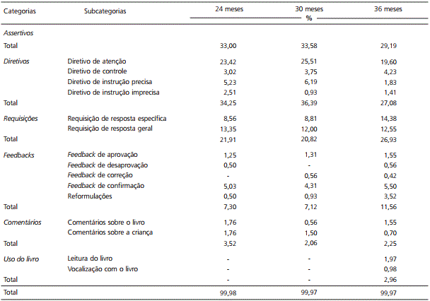 Ressalta-se que, em torno dos 30 meses, as pequenas frases emergiram, sobretudo, nos epi-sódios em que as díades se engajavam na elabo-ração das primeiras narrativas infantis, as quais são associadas a uma maior participação e iniciativa das crianças nas interações (Kelly & Bailey, 2012). Assim, observou-se um avanço com relação ao uso das "Respostas verbais adequadas" e "Respostas não verbais adequadas" e uma redução nos índices de "Não respostas" e "Repetições espontâneas", en-quanto o "Gesto de apontar espontâneo" manteve--se constante aos 24 meses, como é possível verificar na Tabela 2.