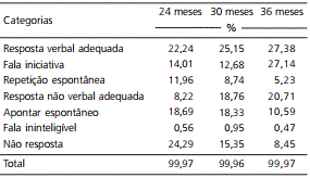 Observa-se ainda que os comportamentos de "Não resposta" e "Repetição espontânea" ten-deram a ser menos utilizados quando as crianças se encontravam em torno dos 30 meses e, posterior-mente, dos 36. Quanto ao "Gesto de apontar es-pontâneo", observa-se que, apesar da sua frequên-cia ter se mantido estável entre as etapas dos 24 e 30 meses, esse comportamento também foi menos incidente na faixa etária dos 36 meses.