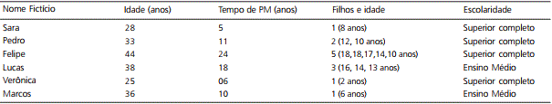Participaram do estudo seis policiais militares de um estado brasileiro, sendo quatro homens e duas mulheres. As informações relativas aos parti-cipantes da pesquisa estão na Tabela 1 e foram obti-das durante a entrevista individual. Foram utilizados nomes fictícios para garantir o sigilo e o anonimato total dos participantes.