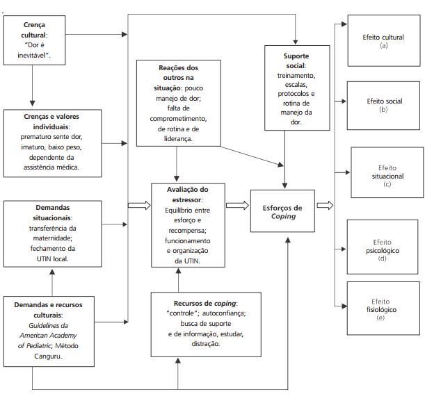 O modelo sociocultural de estresse, coping e adaptação (Aldwin, 2009) permitiu melhor compreensão sobre como o contexto cultural afeta a maneira do profissional de saúde lidar com o estresse do trabalho, por identificar os fatores da cultura organizacional, os quais podem influenciar suas práticas. Essa identificação viabiliza a proposição de estratégias específicas, que possam culminar com a mudança necessária de comportamento para que medidas de alívio de dor sejam implantadas de forma efetiva no ambiente da UTIN.