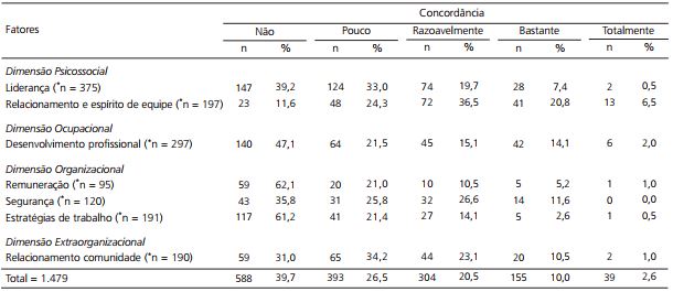 4) Escala de Clima Organizacional para Organizações de Saúde (ECOOS) (Menezes et al., 2009): a escala foi adaptada para esta pesquisa e contou com 60 itens, quatro a menos que a versão original, isso porque os mesmos não tinham relação com a UTIN. Os itens são organizados em sete fatores: liderança; desenvolvimento profissional; relacionamento e espírito de equipe; relação com a comunidade; segurança no trabalho; estratégias; e remuneração. A análise é baseada em quatro dimensões: Psicossocial, Organizacional, Ocupacional e Extraorganizacional;