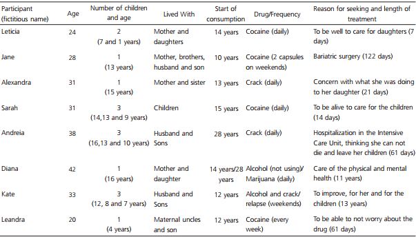 In order to characterize the participants, Table 1 was prepared containing some of their characteristics. The participants had a mean age of 30.9 years (Standard Deviation - SD = 7.1) and mean of 1.9 children (SD = 1.0). It was observed that 5 of these did not have a partner in the household, while 1 resided only with her children. The reasons which led them to seek treatment were varied, however, for the majority (5 women) the reason appeared directly related to concerns for the children. It should also be noted that the drug use began in childhood and adolescence, with a mean age of onset of consumption of 14.7 (SD = 5.6) years. Regarding the drug used at the time of seeking treatment, 7 reported using cocaine, with 3 of these consuming it in the form of crack. The length of treatment of the women varied, with a minimum time of 7 days and maximum of 13 years.