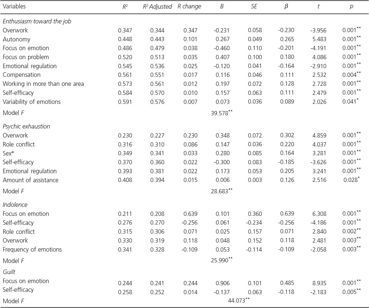 The variation of the Psychological exhaustion dimension is explained in 39.4% by a model composed of six variables, and overwork once again was the variable with the greatest explanatory power, with a variance of 23%. The variables that contributed to the increase in the psychological exhaustion were overwork, role conflict, effort to express feelings adequate to the work context, amount of service provided daily, and decrease in self-efficacy. Males present greater psychic exhaustion.