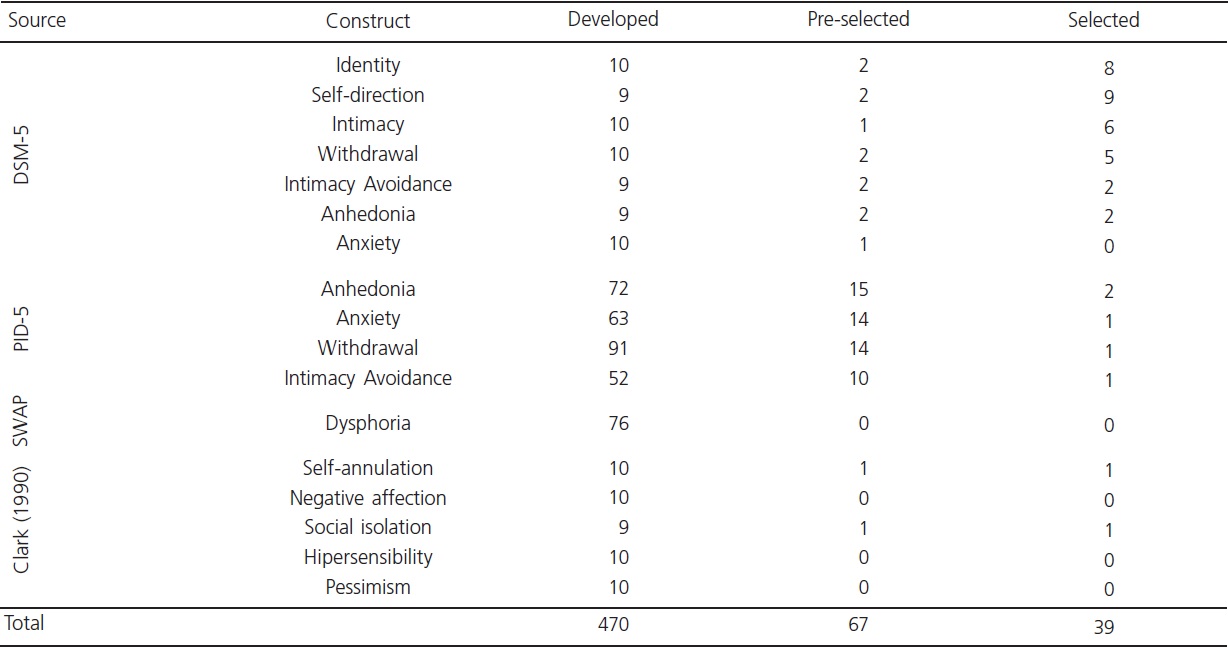There were no any items selected for the dimensions dysphoria, negative affect, hypersensitivity, and pessimism in the final stage since the items were redundant, and the objective was to introduce items that would enhance the representativeness of the construct in this dimension, with different content from that in the original version. Some constructs, such as withdrawal and anxiety, are repeated in Table 1 because the PID-5 is based on the DSM-5, also used in this study; however, the construct definitions were based on the DSM-5 and PID-5 items were used, which are as similar but not identical.