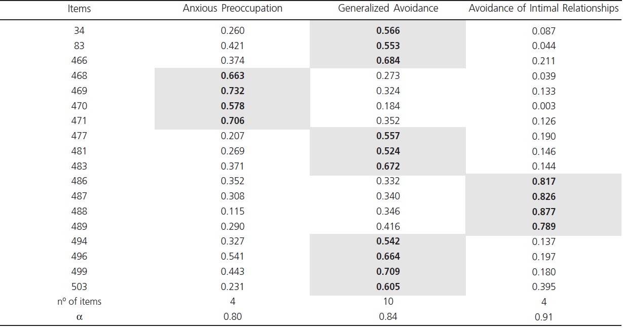 After psychometric analysis, the Criticism Avoidance revised dimension had a total of 18 items, including two original items and 16 new items. These items were divided into three factors: Anxious Preoccupation (4 items), Generalized Avoidance (10 items), and Avoidance of Intimate Relations (4 items), which had adequate internal consistency coefficients (Embretson, 1996; Nunnally, 1978).