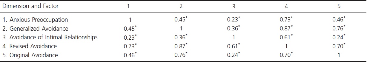 It was observed that most of the correlations among the factors of this dimension ranged from low to moderate, which suggests the possibility of discriminating individuals according to personality profiles using the Criticism Avoidance dimension. This should be verified in further studies and may be of great interest for the use of IDCP in the clinical context. With regard to the correlations between the factors with the original dimension, the lowest correlations were found with the factors Anxious Preoccupation and Avoidance of Intimate Relations, indicating that the revised dimension has these characteristics, which were poorly represented in the original dimension. Furthermore, the correlation between the total scores of the original and the revised versions suggests that the set of items developed are related with each other, but they are still different from the traits analyzed.