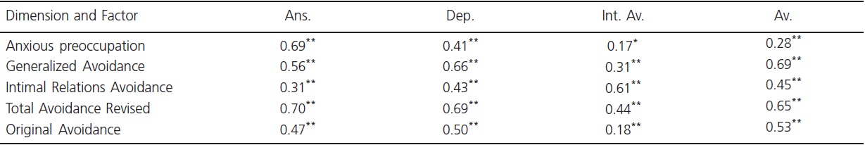 It is important to note that the correlations between the factors of the revised dimension and the facets of the NEO-PI-R ranged from 0.08 to 0.56, and those between the facets and the total score of the revised dimension ranged from 0.24 to 0.56. Moreover, the correlations between the original total score of the dimension and the dimensions of NEO-PI-R ranged from 0.16 to 0.56. In all factors, the revised dimension had higher correlation than that of the original dimension, except for the Consciousness/Embarrassment facet, which had similar correlations to those of the original dimension. The correlations between the Criticism Avoidance revised dimension and Neuroticism, Vulnerability, and Consciousness/Embarrassment were higher than those of the original dimension. Comparing the factors of the revised dimension with those of the original dimension, it was found that Anxious Preoccupation had higher correlation with Neuroticism; Generalized Avoidance had higher correlation with the embarrassment facet; and Avoidance of Intimate Relations had higher correlation with Vulnerability although it had low correlations with all facets. Despite the differences between the total scores (original and revised) and the facets of Neuroticism, the difference found in the correlation of this factor with the total scores was not significant (p > 0.05).