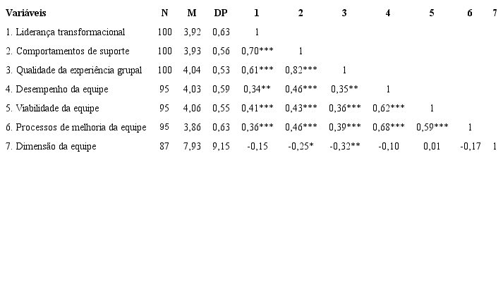 Na Tabela 1 são apresentadas as médias, os desvios-padrão e as correlações entre todas as variáveis em estudo. Como é possível verificar, as correlações da variável de controle (dimensão da equipe) com as outras variáveis não são significativas, com exceção dos comportamentos de suporte e da qualidade da experiência grupal. Assim, seguindo as recomendações de Becker (2005) para omitir as potenciais variáveis de controle que não se correlacionam com as variáveis critério, a dimensão da equipe foi apenas considerada nas análises relativas aos comportamentos de suporte (H1) e à qualidade da experiência grupal (H2c e H3c).