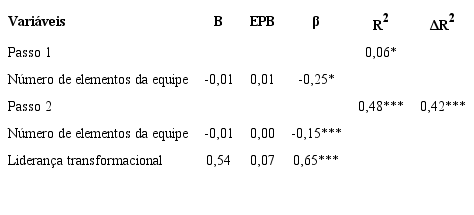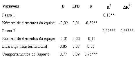 A Hipótese 1, que prevê uma relação positiva entre a liderança transformacional e os comportamentos de suporte, foi suportada (α = 0,65, p < 0,001) (Tabela 2). Os resultados das regressões múltiplas que permitiram testar as hipóteses restantes (H2 e H3) são apresentados nas Tabelas 3 e 4. Como é possível observar na Tabela 3, na regressão múltipla com a liderança transformacional e os comportamentos de suporte como variáveis preditoras e o desempenho como variável critério, há um efeito positivo significativo dos comportamentos de suporte no desempenho da equipe (β = 0,43, p = 0,001), corroborando, assim, H2a. A hipótese H3a, que considera os comportamentos de suporte como variável mediadora na relação entre a liderança transformacional e o desempenho da equipe, também foi corroborada, uma vez que (a) a liderança transformacional apresenta uma relação positiva significativa com os comportamentos de suporte (α = 0,65, p < 0,001), (b) os comportamentos de suporte apresentam uma relação positiva significativa com o desempenho da equipe (β = 0,43, p = 0,001), após o controle da liderança transformacional, (c) e o efeito mediado estimado (αβ = 0,28) foi estatisticamente significativo (P = Zα x Zβ = 30,75, p < 0,01). Como é possível verificar, os comportamentos de suporte medeiam totalmente a relação entre a liderança transformacional e o desempenho da equipe, dado que o efeito direto da liderança transformacional no desempenho da equipe não é significativo (τ = 0,05, p = 0,705).