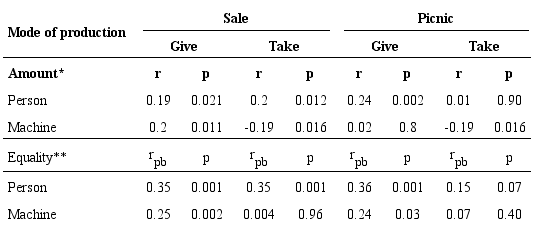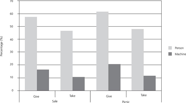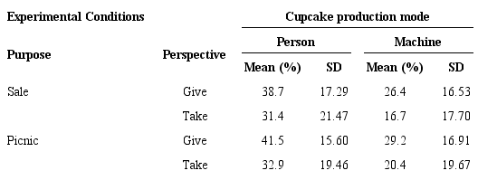 The results show that the highest average percentage of cupcakes gave to the second character was observed in the story in which the cupcakes were made with the help of another person and would be taken to a picnic (41.5%). On the other hand, the lowest average percentage of cupcakes was observed in the story in which the participant took the cupcakes from someone who had used his/her machine to sell them (16.7%) (Table 1).