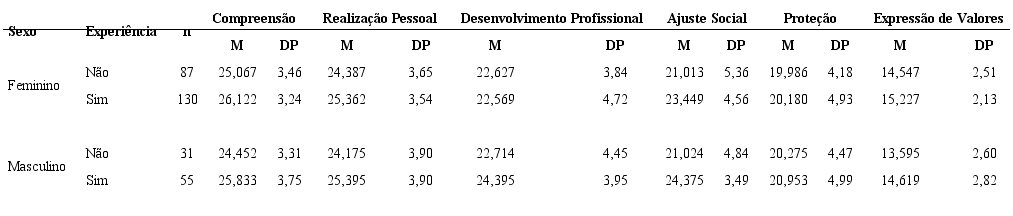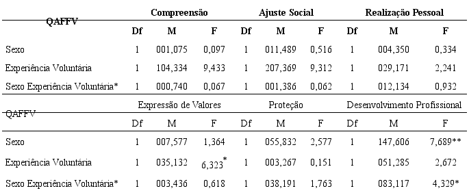 Realizou-se uma Análise de Variância (ANOVA) com a finalidade de explorar se existem diferenças significativas sobre as dimensões do QAFFV em função do sexo e da experiência voluntária. A Tabela 2 apresenta os resultados dessa análise, destacando a existência de interação significativa na função do voluntariado para o “Desenvolvimento Profissional” (F = 83,117; p = 0,038).