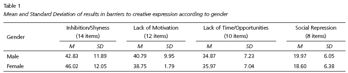 Regarding gender, the perceptions about barriers to creative expression expressed by the whole sample (values of Means and Standard Deviations) are presented in Table 1.