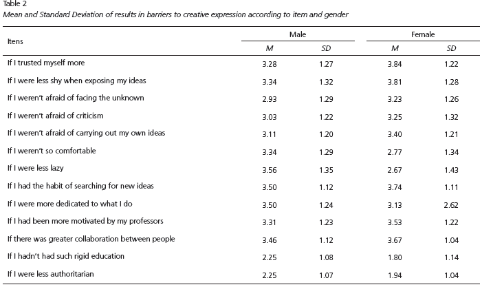 Based on the analysis per factor in the inventory, the superiority of women reported in Inhibition/Shyness, as well as the superiority of men reported in Lack of Motivation, are echoed in the few studies on the subject (Alencar, 2001; Alencar et al., 2003). Contrary to these studies, a superiority of men was reported in Social Repression. A detailed analysis per item may provide a greater understanding of such data and of differences related to the Lack of Time/Opportunities.